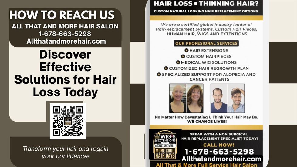 A collection of images showcasing various hair salon advertisements, including promotions for wigs, hair extensions, and hair loss solutions.